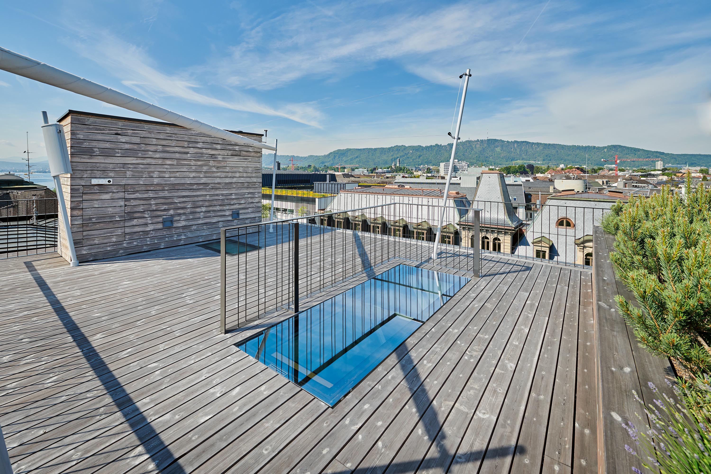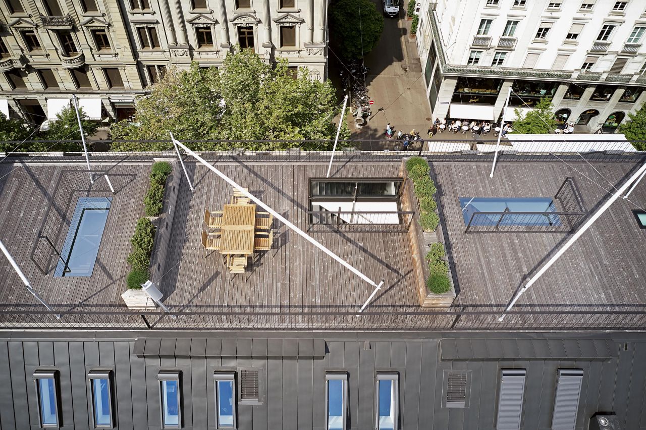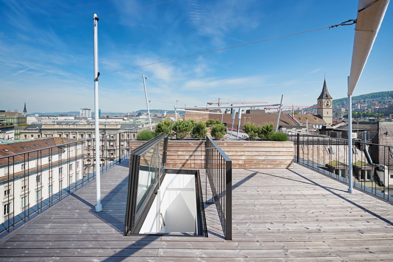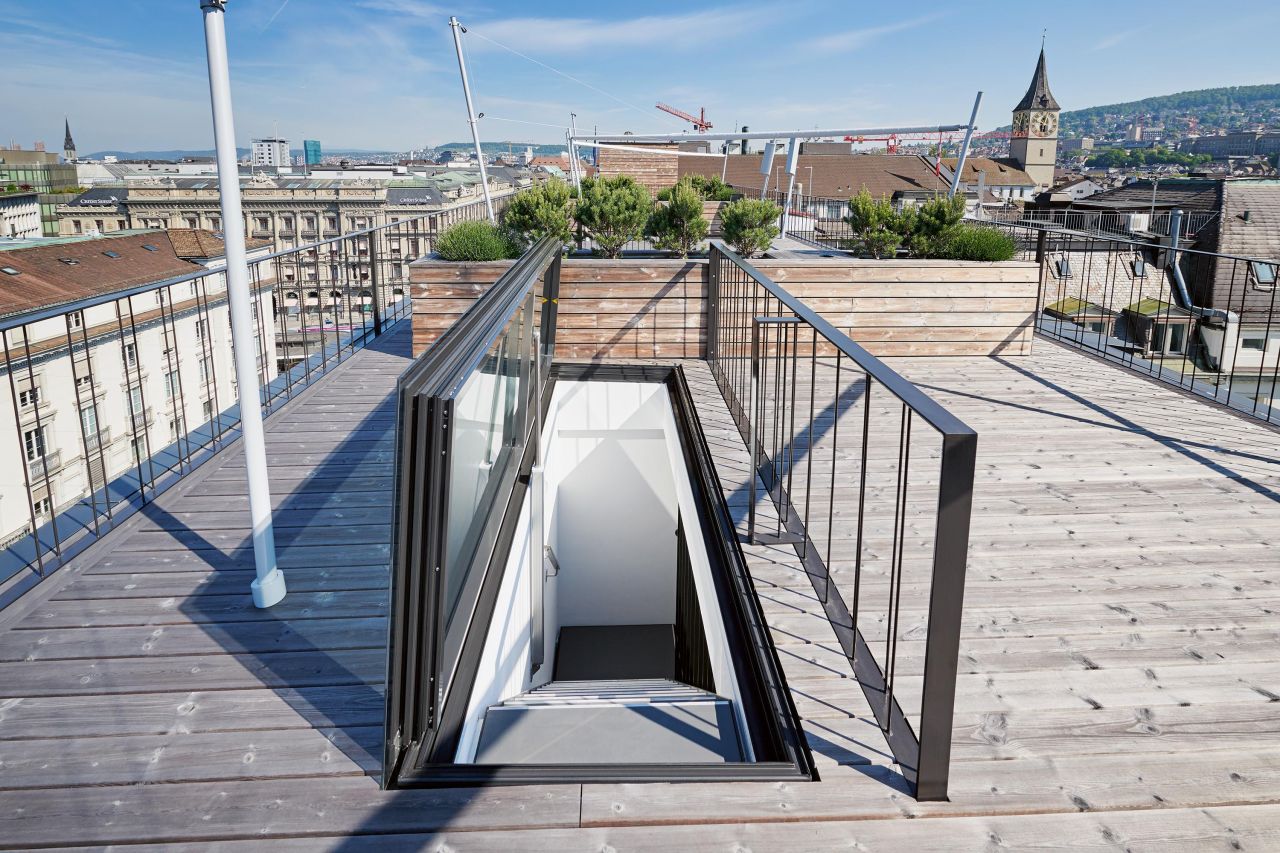 Beim Projekt an der Bahnhofstrasse in Zürich wurde die Scheibe nahtlos in den Terrassenboden integriert. Damit fügt sich der Dachausstieg sowohl von innen als auch von aussen unauffällig in die gegebene Situation ein.